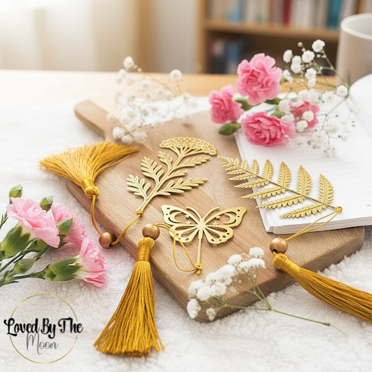 How beautiful are these gold metal bookmarks? Each bookmark features delicate detailing and a soft gold finish, complete with a matching tassel for an elegant touch. You can choose from three designs: a fern leaf, a celestial butterfly or a wild meadow flower.