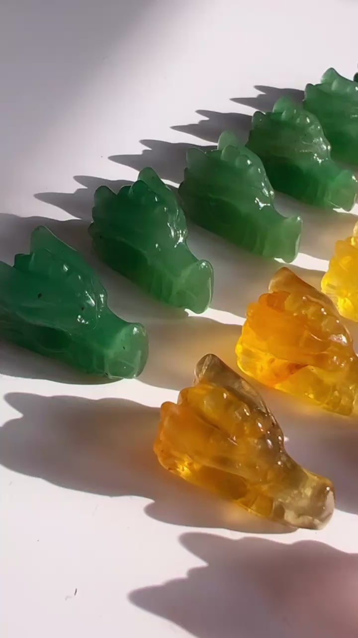 Colourful crystal-like dragon head carvings arranged on a white surface