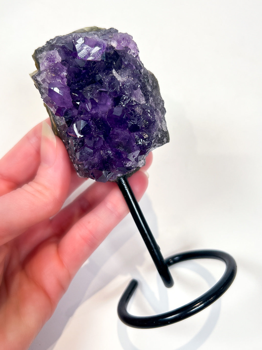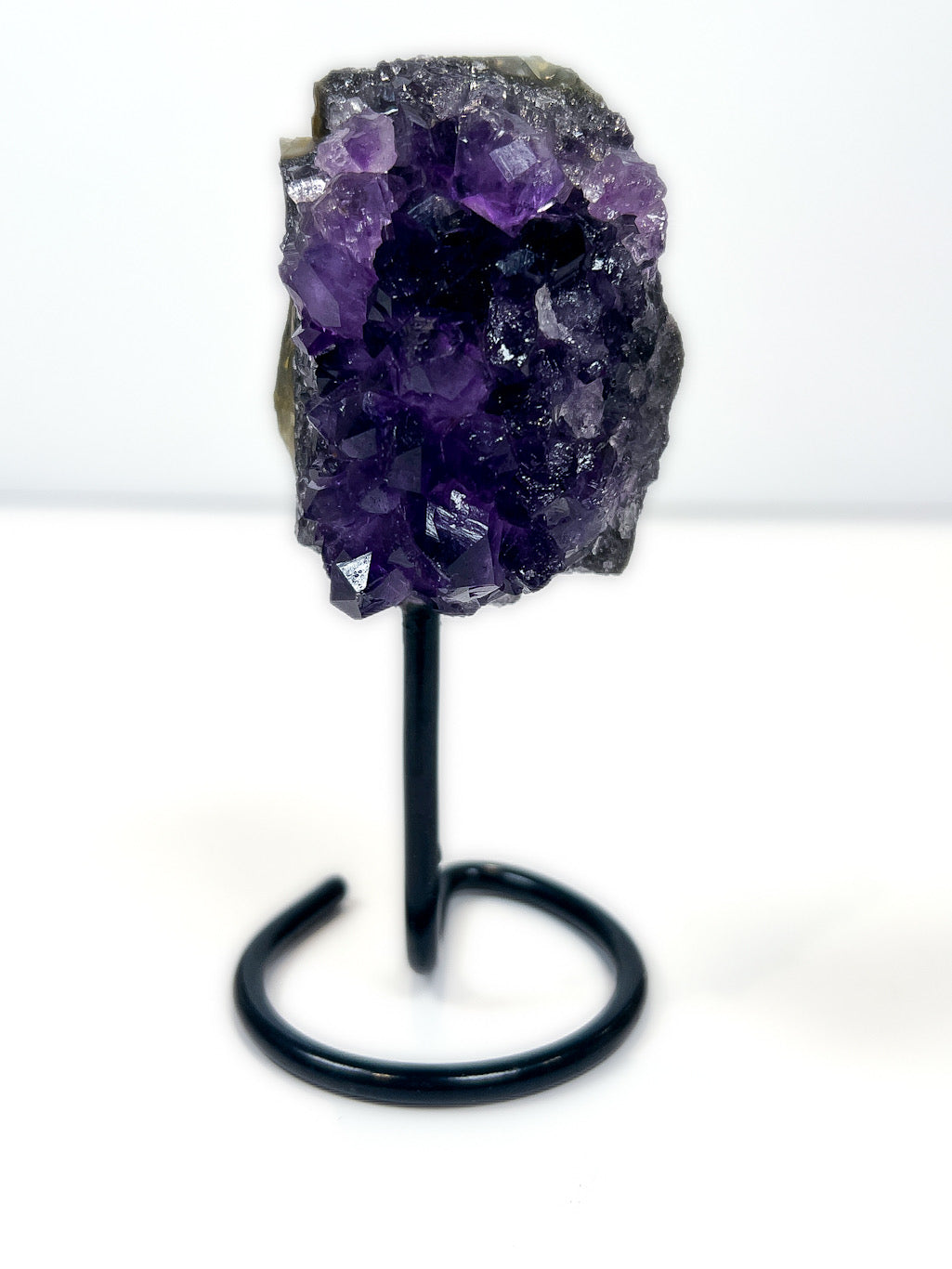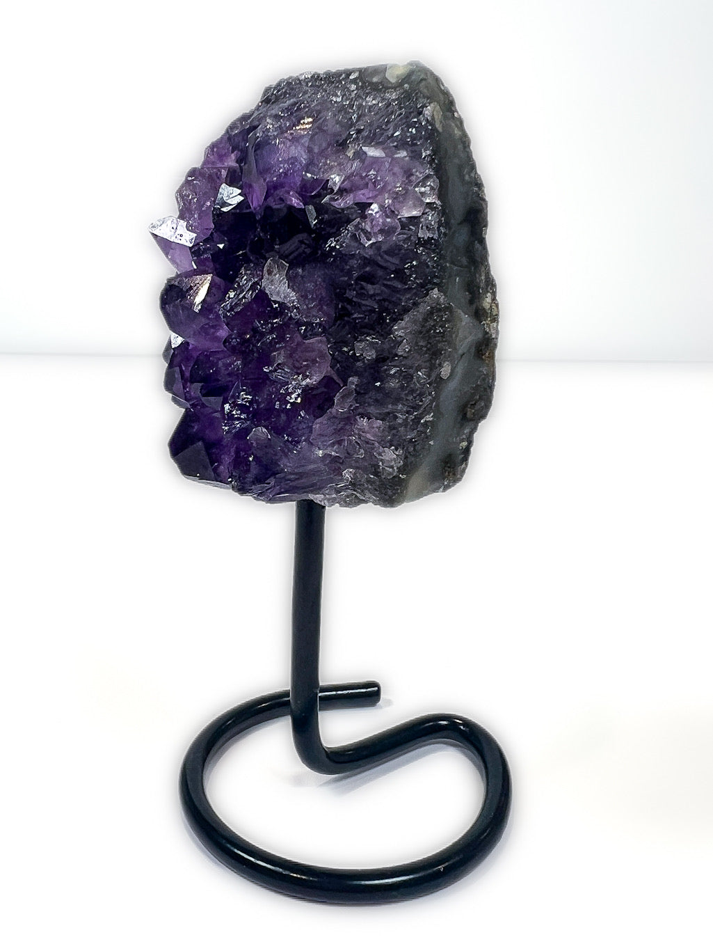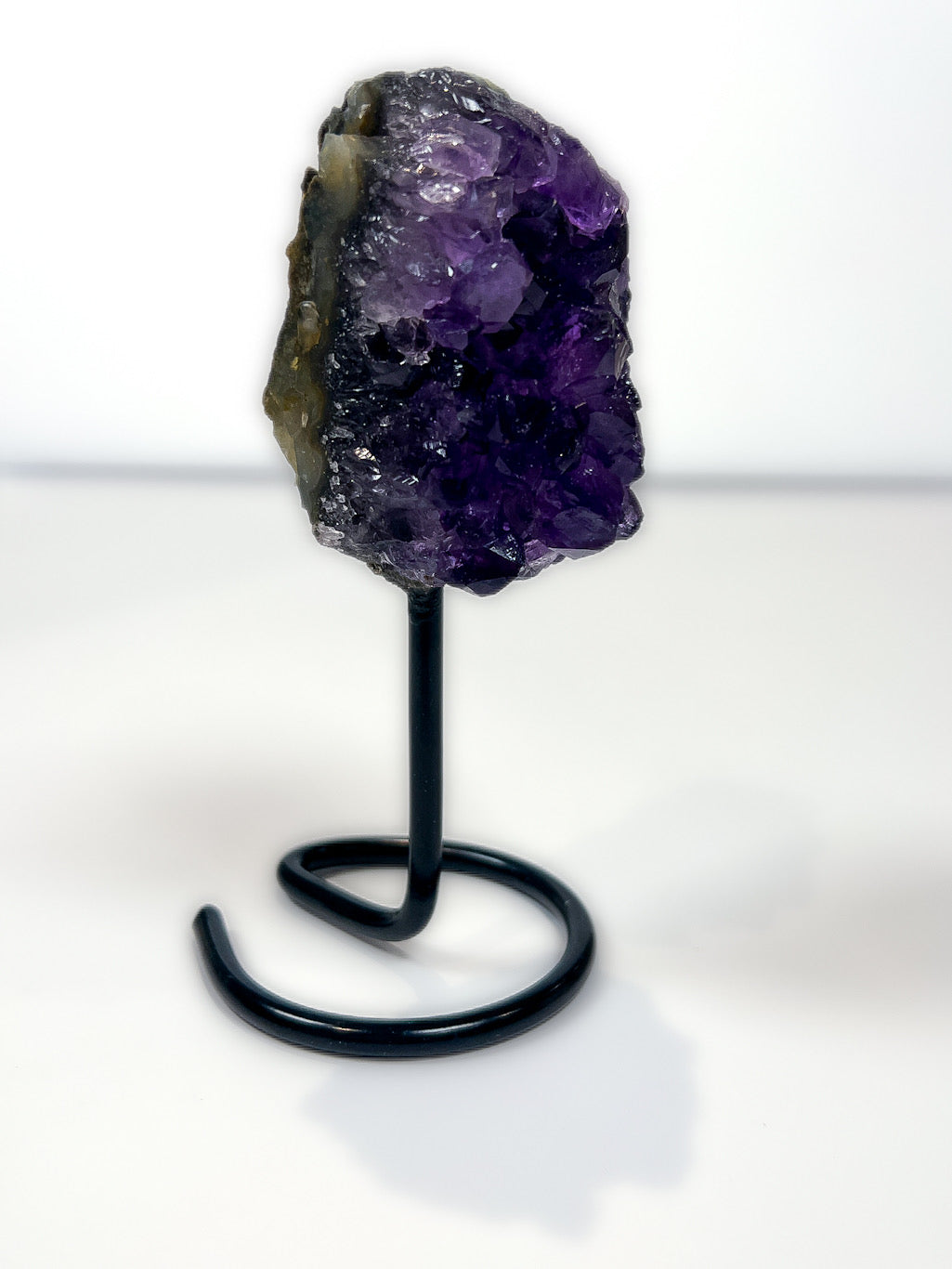 Mounted on a sleek black metal stand, this Amethyst cluster becomes a statement piece for any home, altar, or sacred space. Amethyst is often chosen by those seeking a sense of peace, mental clarity, and energetic protection, especially in spaces where grounding and calm presence are valued.
